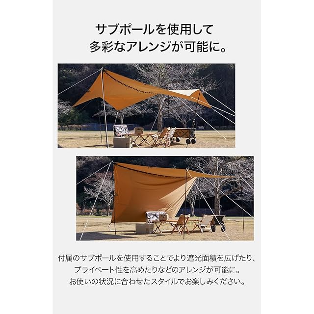 【製品サイズ】 サイズタープL:480cm×470cm 重量(付属品含む) Lサイズ:11.05kg(ポール含む)メインポール長さ:240cm直径:25MM厚み:0.8MM サブポール長さ:200cm直径:22MM厚み:0.8MM