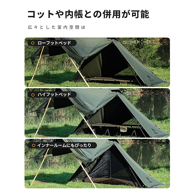 【広々とした便利な空間】二股ポールを採用することで、従来のシングルポールテントに比べ、テント内部の活 動スペースが広がります。後方の換気用三角窓に短いポールが追加され、十分な睡眠スペースを維持し、シン グルキャンプベッドのセットアップ (トールモード) を簡単に収容でき、快適な居住空間を求める方にもおすすめし ます。