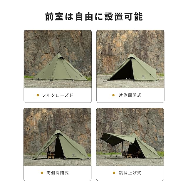 【商品仕様】耐水圧:表面は防カビ・防水加工を施しており、耐水圧は300mm~400mmです。フロアサ イズ :縦260cm×横260cm×高さ180cm。パッケージ内容:3mロープ×6;テントペグ×14;Aフレー ムテントポール1セット×1;スタッフサック×1;テント本体×1;ストーブジャック×1。ご注意:二又ポール1セ ットのみが含まれており、前室を支えるポールは別途購入する必要があります。