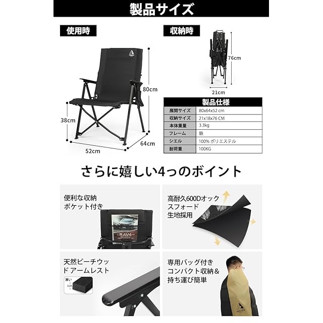 上質な使い心地: 天然ビーチウッドの肘掛けが高級感を演出しながら、サイドポケットにはスマートフォンやドリンクを収納可能。細部までこだわった使いやすさで、快適なアウトドアタイムをサポートします。