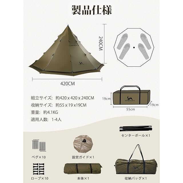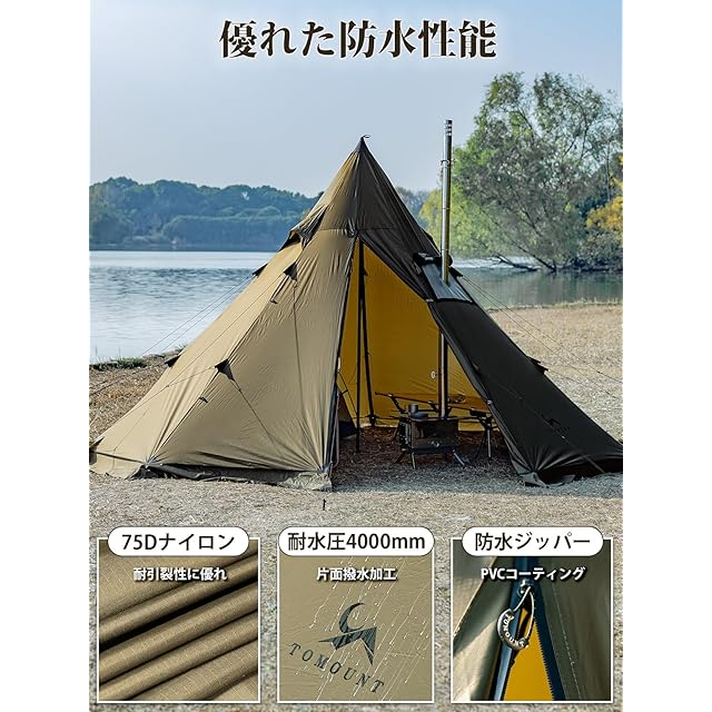 TOMOUNT ワンポールテント 高さ2.4m 75Dナイロン ホットテント 直径4.2m 耐水圧4000mm 1-4人用 大型ティピーテント 十角形 軽量 引裂き防止 煙突穴付き 簡単設営 多機能 通気性 4シーズン適用 キャンプ用 アウトドア