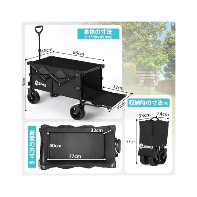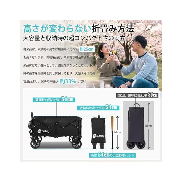 Sekey 後ろ開け キャリーワゴン 長物対応 大容量200L 耐荷重150kg 【収納サイズが類似品で最小級】【ベアリング搭載の大型ノーパンクタイヤ】【ブレーキ付き】アウトドアワゴン 軽量 自立収納 静音 キャンプ・レジャー・釣り・運動会 キャンプカート 黒