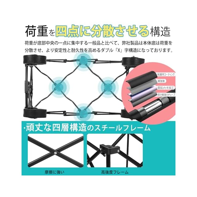 【荷重を四点に分散させる超安定な構造】荷重が底部中央の一点に集中する一般品と比べて、弊社製品は本体底は荷重を四点に分散させ、より安定性と耐久性を高めるダブル「X」字構造になっているキャリーカートです