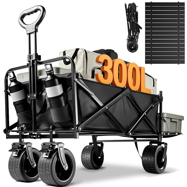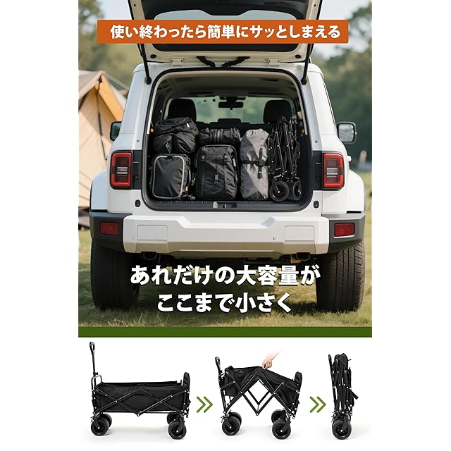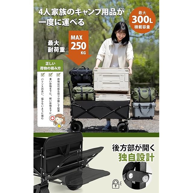 【300Lの超大容量&驚くほどコンパクトな収納】✅ Aasnsnのキャンプワゴンは300Lの大容量を実現し、リアゲート(後部扉)の設計をさらに進化させました。これにより、アウトドアワゴンの積載長さが150%アップ!このキャンプワゴンの魅力は、大量の荷物を収納できることです。手作業で運ぶ場合と比べて、約4倍の荷物を楽に運搬でき、駐車場からキャンプ場などへの往復の負担を軽減します。
