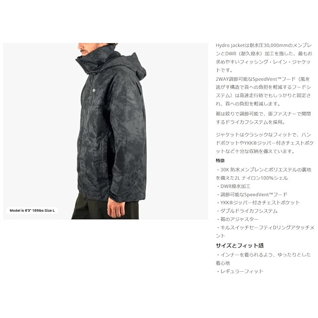 素材: 表 2層構造 ナイロンシェル&メンブレン , 裏 ポリエステル / 特徴:「2層 耐水圧 30,000mm メンブレン」「DWR撥水加工」「SpeedVentフード(2WAY調節可能)」「ダブルドライカフシステム」「裾 絞り調整」「YKKジッパー胸ポケット」「キルスイッチ安全Dリングアタッチメント」