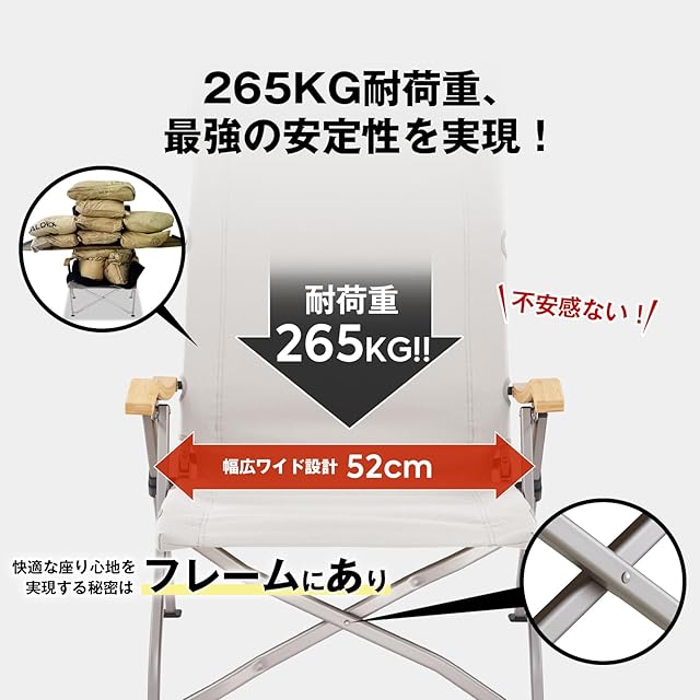265KG耐荷重、最強の安定性を実現!:アウトドア椅子は1600Dポリエステル、A7075アルミ合金フレームを採用した設計で、265KGまでの耐荷重!さらに、座面を深くするし、ハンモックのように体にフィットし、ゆったりと包み込まれる最強の安定性を実現したアウトドアチェアです。