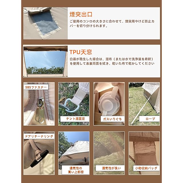 【オールシーズン使える】TCテントの最大の特徴は、優れた通気性と断熱性。 特殊処理TC綿生地は日差しを効果的に遮断し、紫外線を防ぎます。 夏、二重ドアに四面窓を加えて設計され、テントの換気がよく、涼しさを確保します。 冬には、tcコットンがテント内の熱を維持します。