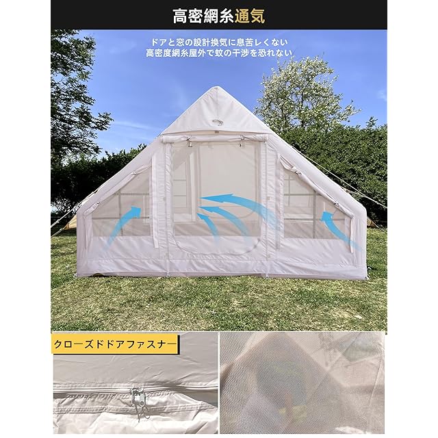 【耐久性に優れた良質な素材】テントの生地は通気性のTC素材(ポリエステル65%と綿35%の混紡生地)を採用し、優れた通気性と難燃性を持ち、夏はムレにくく、冬は寒さを感じません。 底部にはPVCクリップメッシュを採用、3000+防水。 空気入れ柱は大径気柱を採用し、pvc材質で、耐磨耗で刺されにくい、二重の密閉口より安定で長持ちします。