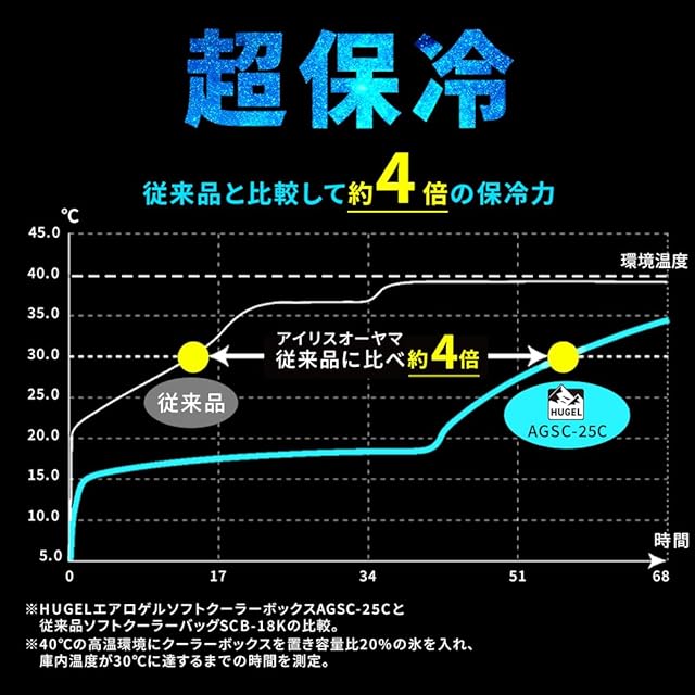 宇宙服にも使用される、高断熱素材“エアロゲル”を使用したソフトクーラーボックス。冷気が逃げにくく、ハードタイプに負けない保冷力。最大保冷時間:約5.1日(※)。(※本体容量40%相当の氷を入れ、底面温度が8℃に達するまでの時間。環境温度:30℃→9時間・20℃→15時間の繰返し。)