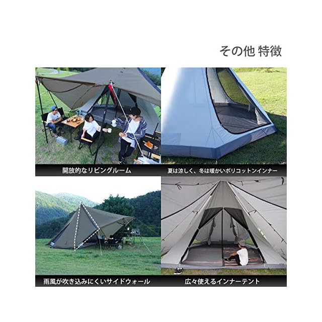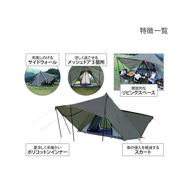 材質:フライシート:150Dポリエステル(PUコーティング) メインポール:スチール インナーテント:ポリコットン(ポリエステル65%、綿35%) フロア:210Dポリエステル(PUコーティング)