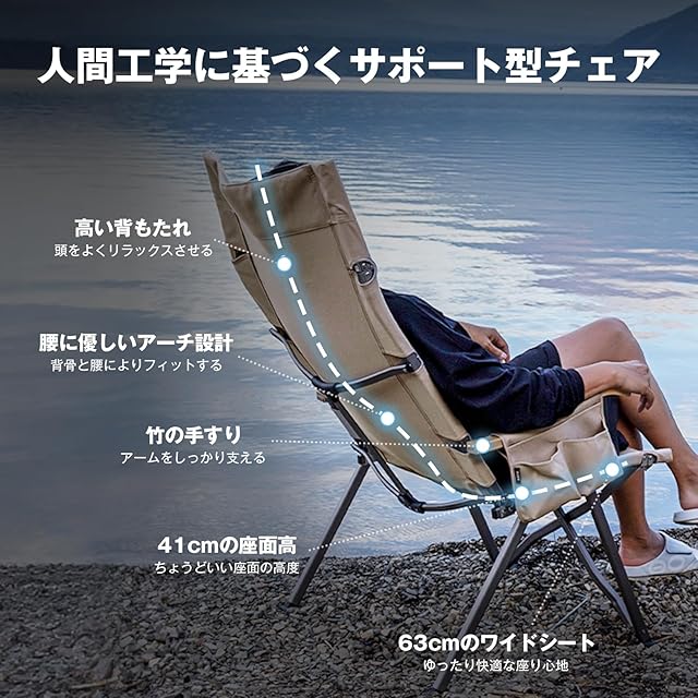 265KG耐荷重、最強の安定性を実現!:アウトドア椅子は1600Dポリエステル、A7075アルミ合金フレームを採用した設計で、265KGまでの耐荷重!さらに、座面を深くするし、ハンモックのように体にフィットし、ゆったりと包み込まれる最強の安定性を実現したアウトドアチェアです。