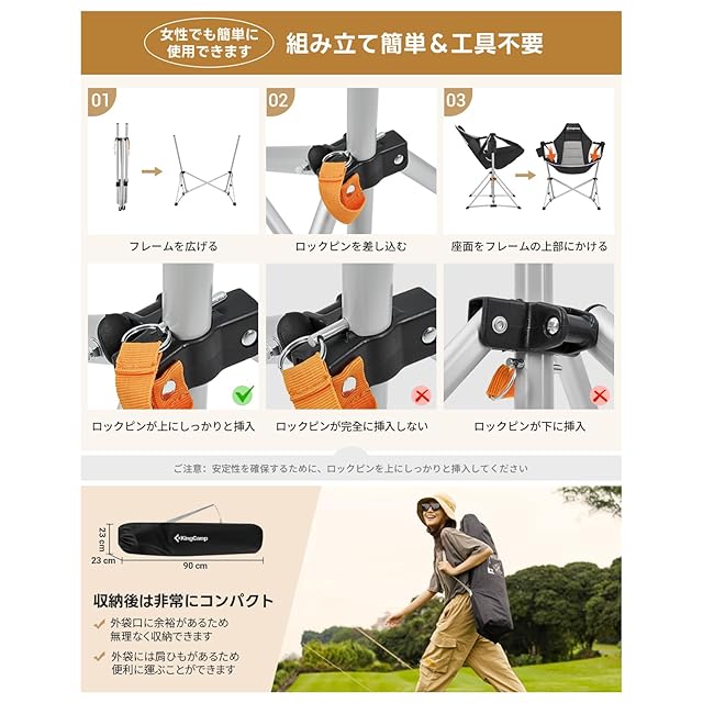【簡単3ステップで組み立て完了】フレームを広げ、ロックピンを差し込み、座面をフレームの上部にかけるだけで完成します。注意点としては、安定性を確保するためにロックピンをしっかり差し込んで使用する必要があります。