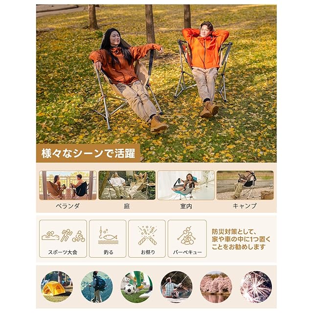 【安定性と通気性に優れる】このアウトドアチェアは、強度が高いA6063アルミ合金のフレームを使用しており、交互に配置された三角形の形状で、揺り椅子としても安定性があります。また、背中とお尻の部分は発汗しやすいため、通気性に優れたメッシュ生地を使用しています。濡れてもすぐに乾きます。