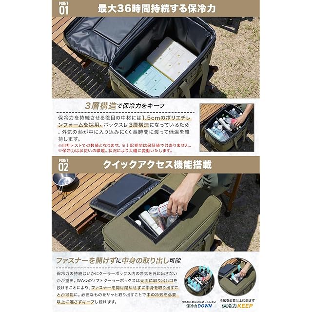 ✔【用途によって選べる2サイズ展開】Sサイズは1〜2人ぐらいまでのキャンプに最適な容量35L。食材や飲み物のスペースを分けるときに内部を区切るための仕切り板が2枚付属。Mサイズはファミリーキャンプに最適な42Lの大きさ。Sサイズと同じく仕切り板が2枚付属しているため食材や飲み物のスペースを区切るときにご活用ください。【クイックアクセス機能搭載】保冷力の持続はいかにクーラーボックス内の冷気を外に出さないかが重要。WAQのソフトクーラーボックスは天面に取り出し口を設けることにより、ファスナーを開け閉めせずに中身を取り出すことが可能に。必要なものをサッと取り出すことで中の冷気を必要以上に逃さずキープし続けます。
