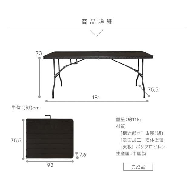 サイズ:幅181x奥行75.5x高さ73㎝(折りたたみ時:幅92x奥行75.5x高さ8.3㎝)