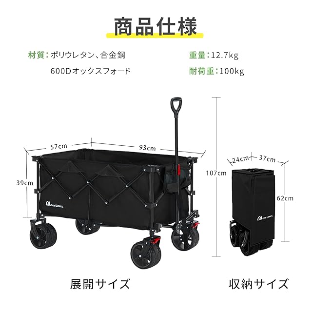 ❀使用時:約93(長さ)×57(幅)×62(高さ)cm / 収納時:約37×24×62(高さ)cm / 荷台:85(長さ)*47(幅)*高さ39cm / 本体重量:12.7kg / 耐荷重:100kg / 材質:フレーム -- スチール ・生地 -- オックスフォード