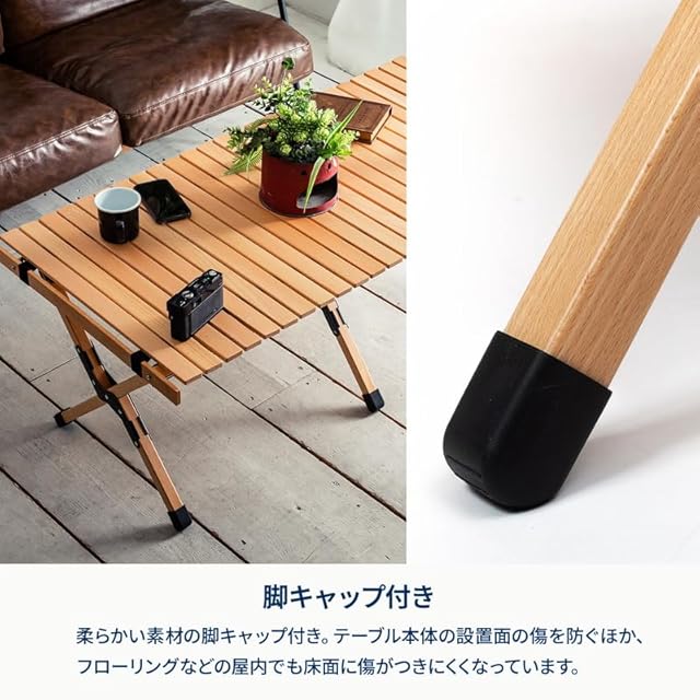 ✅【脚キャップ付き】柔らかい素材の脚キャップ付き。テーブル本体の設置面の傷を防ぐほか、フローリングなどの屋内でも床面に傷がつきにくくなっています。