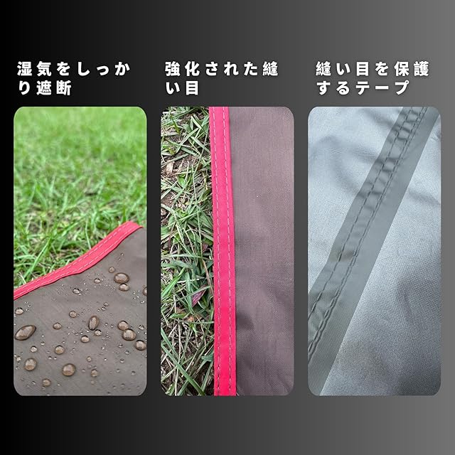 【防水加工&収納袋付き】テントシートは210Dポリエステルオックス素材を使用しており、薄い素材よりも耐久性があります。耐摩耗性にも優れ、長年の使用でも摩耗しにくく、耐久性も高いです。防水性と耐久性を兼ね備えたテントシートで、防水効果に優れたPUコーティングが施されており、耐水圧3000mmです。地面からの湿気や浸水をシャットアウトし、ハトメも補強されています。ペグで固定することができ、ショックコードも搭載されているため、取り付けは簡単です。