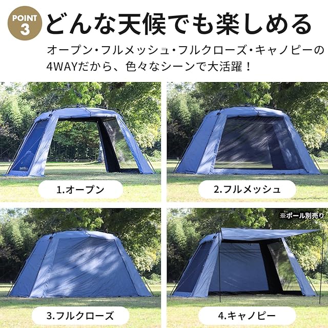 フルクローズ可能な4m幅サイズのワイドスクリーンタープ。