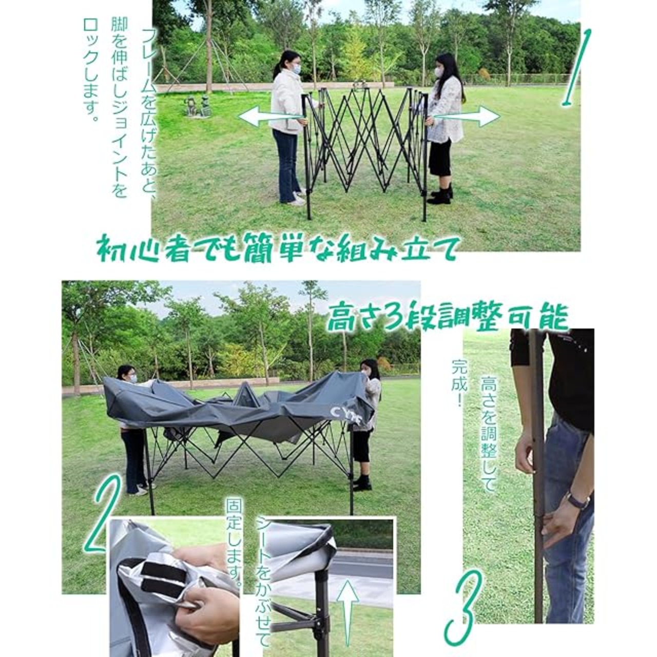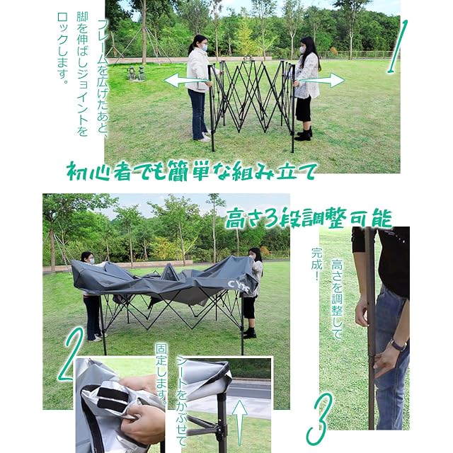 【解放感あふれるタープテント】3m×3m×2.4~2.6mの広いサイズで、室内も、アウトドア用も対応できます。ちなみに、3段階調節でき、場所やニーズによって2.4~2.6mの違う高さを選択できます。可動式のオーニング(ひさし)で直射日光や突然の雨を防ぎながら、開放的な空間をつくれます。学園祭や、運転会、プロモーションイベント、公園のパーティーなど、気軽に対応できます。