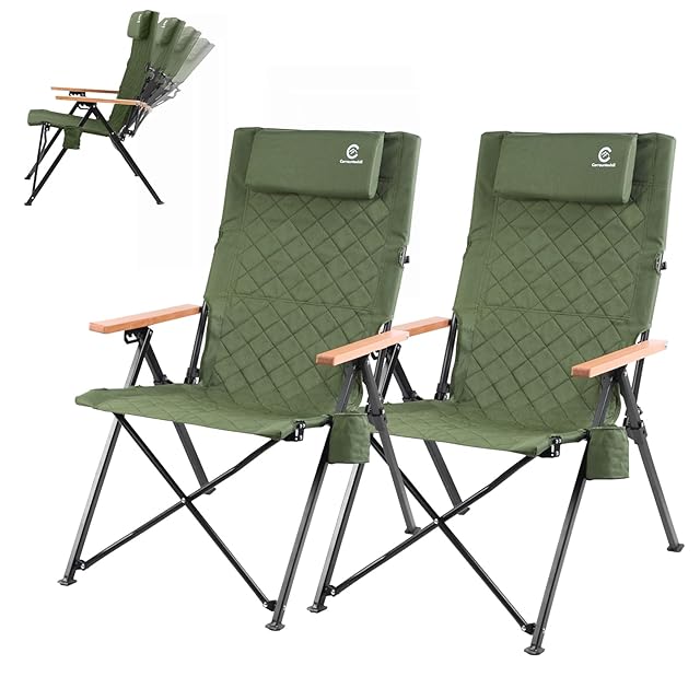 Carrauntoohill アウトドアキャンプリクライニングチェア ヘッドレストとカップホルダー付き4段階傾斜なハイバックチェア コンパクトに折りたたみ収納可能なアウトドアチェア 便利な収納バッグ付き (オリーブグリーン/2点セット)