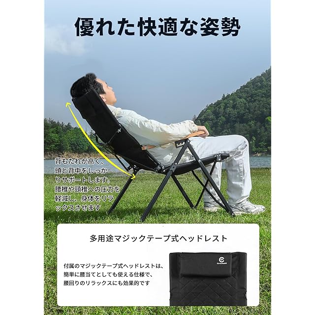 【自由に倾斜角度調整】Carrauntoohillアウトドアキャンプリクライニングチェアは、お好みやシーンに合わせて背もたれのリクライニング角度を自由に調整できます。広くて柔らかいヘッドレストは高さ調節が可能で、さまざまな身長の方にフィット。取り外して腰当てとしても使用でき、全身をリラックスさせる快適な座り心地を実現します。キャンプや焚き火、リビング、ベランダ、オフィスなど、あらゆるシーンで活躍するアウトドア チェアです。