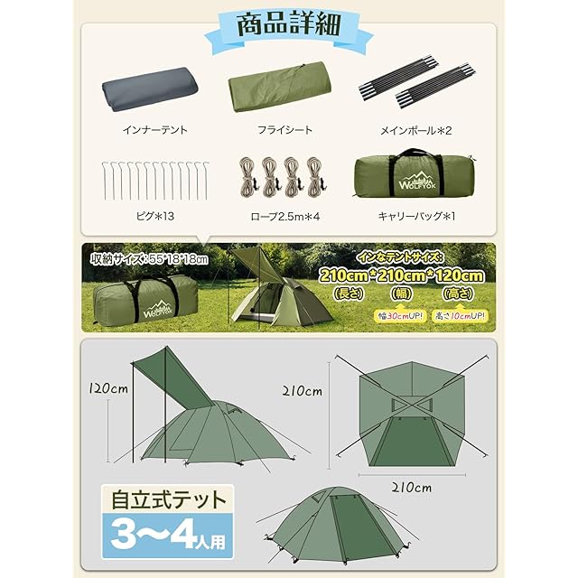 【広さ&快適性】4人用テントです。インナーサイズ:210*210*120(cm)3畳の広い内室です。クイーンサイズベッドのように広々としており、大人2人プラスお子さんでも余裕で,4人用の広いスペースです。ソロキャンプで使えば、寝床だけでなく、荷物置き場も確保できます。他社のテントのような、幅が狭くてキャンプコットを置くこと或いは寝返りをうつことができないといった心配がありません!