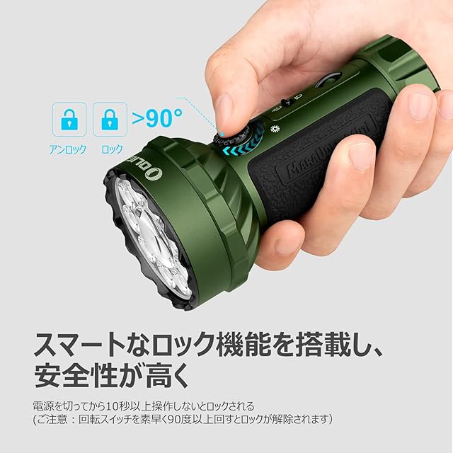 [ロック機能&センサー搭載&インジケーター付き]ロックモードを備えるため、電源を切ってから10秒以上操作しないと、ロックされます。温度センサーと光センサーも搭載し、現場の使用状況に応じて自動的に輝度を下げ、過熱を防止します。また、輝度と電池残量のインジケーターが付き、いつでも懐中電灯の状態をきくっきり確認できます。(ご注意:回転スイッチを素早く90度以上回したらロックが解除されます)