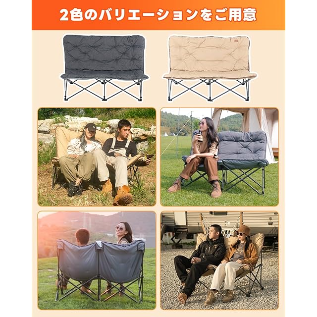 【10Sで簡単に使用できる】この二人掛けチェアは、フレームを展開してクッションをフレームに挿入するだけで即座に使用可能です。キャンプ場に着いたら、サッと広げてすぐに休憩できます。時間も手間もかからず、思い立ったその瞬間からくつろぎタイムが始まります。