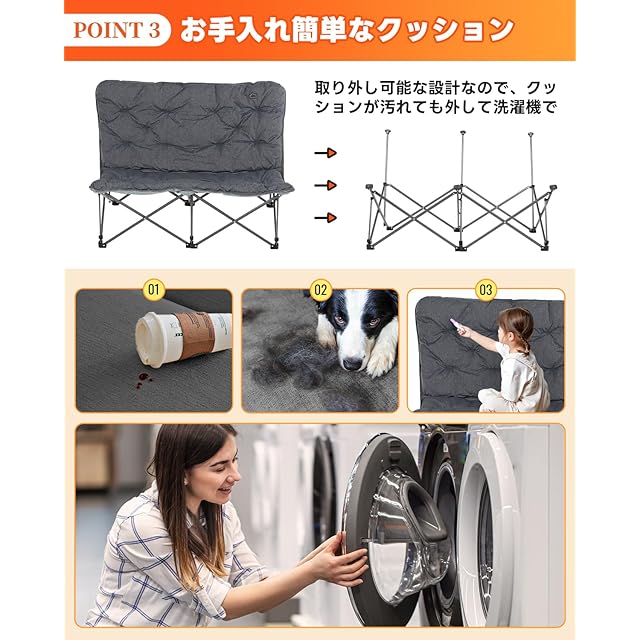 【どんな座り方でも快適な広い座面】夕暮れにリビングでドラマを楽しむときも、週末に家族とアウトドアを満喫するときも、この2人掛けチェアはたっぷりのゆとり空間を提供します。129cmの広々とした座面なら、一人で足を組んだり横になったりしてくつろぐのはもちろん、二人並んで座っても窮屈さを感じません。恋人と寄り添って夕日を眺めたり、友人とお菓子を分け合いながらおしゃべりしたり、子供に寄りかかって絵本を読んであげたり……いつだって心地よい時間が過ごせます。