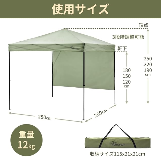 【基本仕様】展開時に2.5x2.5mの日陰面積を提供できます。高さは3段階に調節でき、天井高さ2.5mの開放感のある空間を広げられます。高さ調整には指を挟む等によるケガ発生防止用樹脂パーツを使用しています。ワンアクション機能付きで収納も簡単です。収納サイズ115x21x21cm 重量12kg 収納袋付きなので持ち運びが便利、軽自動車にも楽に積めます。