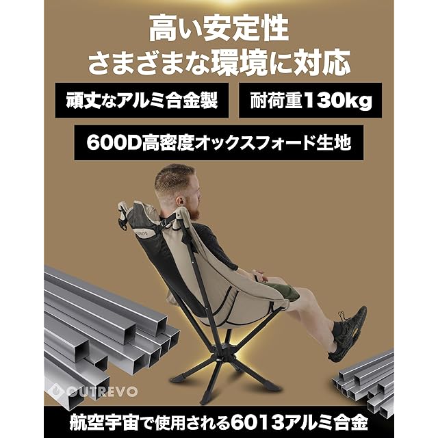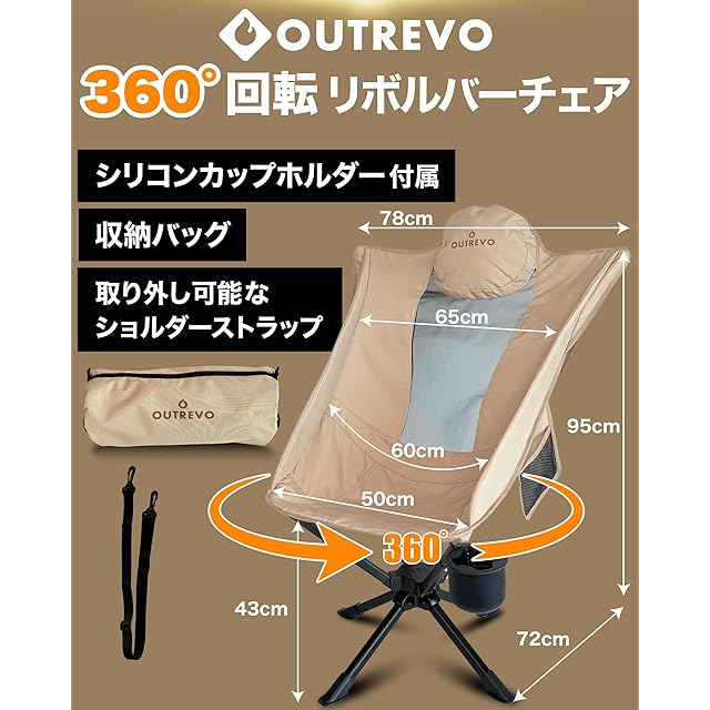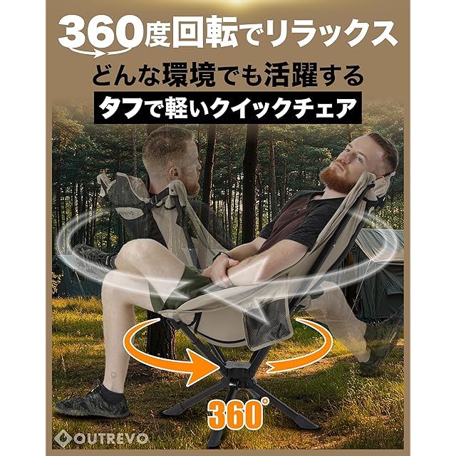 OUTREVO [リボルバープラス] 360度 回転 アウトドアチェア ハイバック 背もたれ コンパクト 軽量 折りたたみ ワンタッチ 椅子 収納袋付き アウトレボ (カーキ)