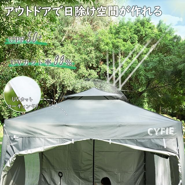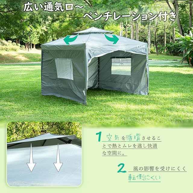 【風を逃がすベンチレーション付き】テント頂部には空気を循環させるベンチレーション付き。風の力を受け流すことで転倒を防止します。【優れた防水性 急な雨にも安心】撥水加工処理済、防水性能の目安となる耐水圧は約1500㎜なので、急な雨や短時間の小雨であれば大丈夫です。ご注意:安全のために、雨が強いや台風などの場合は使用しないでください。
